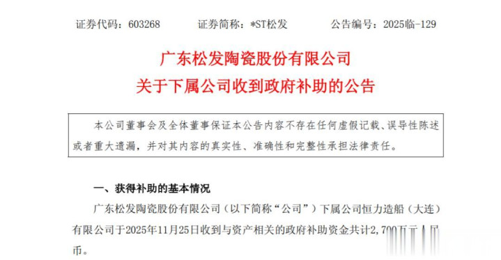 根据公告,*ST松发下属公司恒力造船(大连)有限公司于2025年11月25日收到与资产相关的政府补助资金共计2700万元。